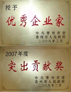 2008年2月14 日,在青州云门剧院召开的全市民营经济发展大会上。我公司荣获07年度“突出贡献奖”及07年度“技术创新先进单位”荣誉称号,并获07年度潍坊市级企业技术中心奖金2万元。徐新民董事长获07年度“优秀企业家”荣誉称号。王春海